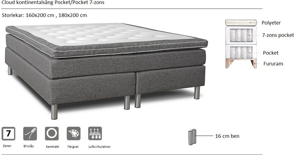 Cloud kontinentalsäng med pocket/pocket. Sängen är uppbyggd med två valbara sängbottnar: 2x80 cm (160 cm) eller 2x90 cm (180 cm) breda. Varje sängbotten är byggd i en 8 cm massiv träram av fingerskarvat furuträ klädd i ett slitstarkt tyg. Även sängbottnarna har ett pocket-fjädersystem som följsamt stöttar upp och stabiliserar pocketfjädringen i mellanmadrassen. Mellanmadrassen är uppbyggd av 13 cm hög 7-zons pocketfjädring för att ge en så följsam komfort som möjligt. Cylinderformade 16 cm höga ben i aluminium gör det lätt att städa under sängen. Ramen är kantförstärkt och fingerskarvad av europaproducerat furuträ för att ge en lång hållbarhet. Sängen Cloud levereras med en 8 cm hög lyxig pikerad bäddmadrass med luftkanaler för skönare sömn.