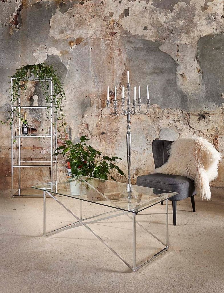 Ett lättplacerat litet soffbord som är inspirerat av Art deco-stilen. Glasskiva och ett underrede i kromad metall!