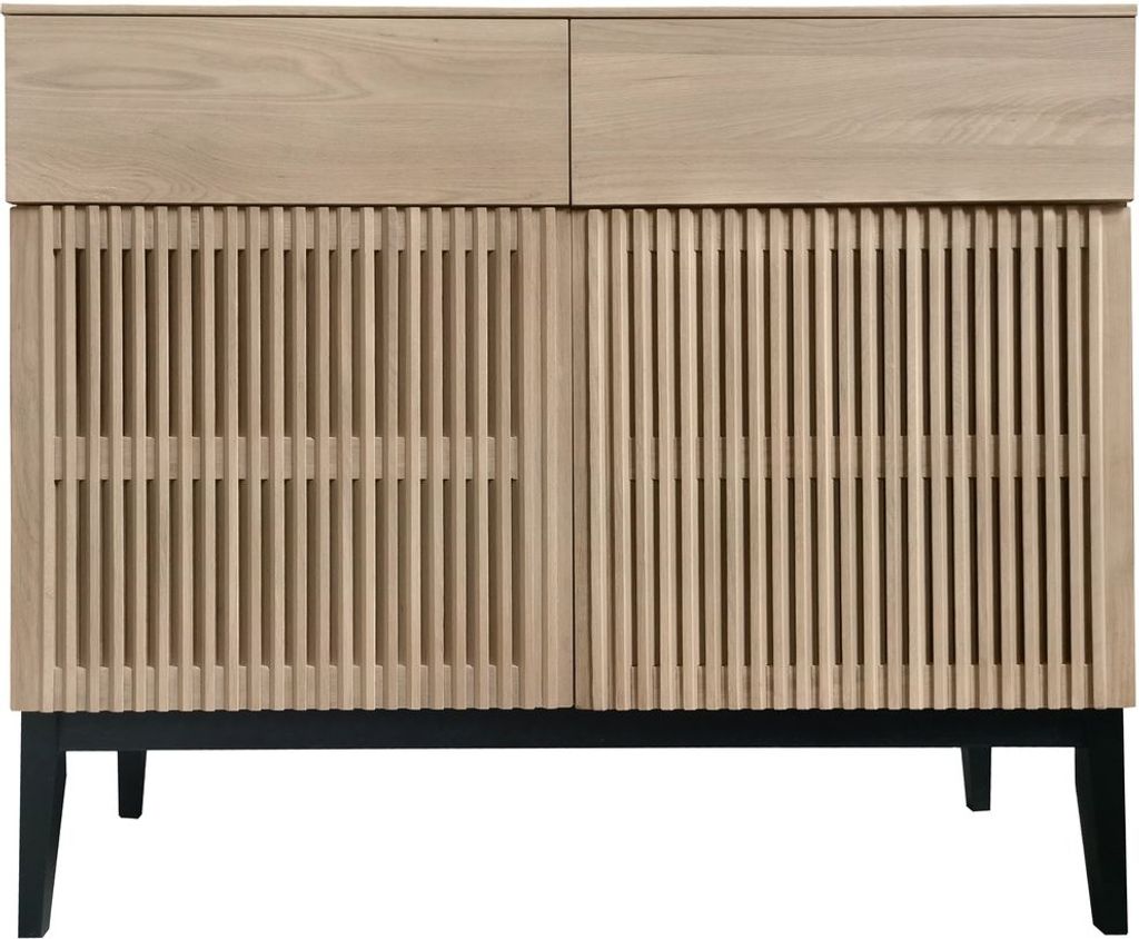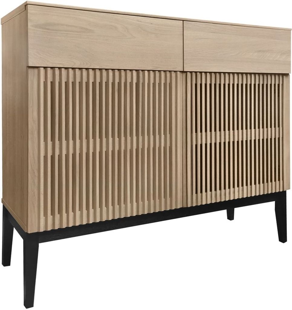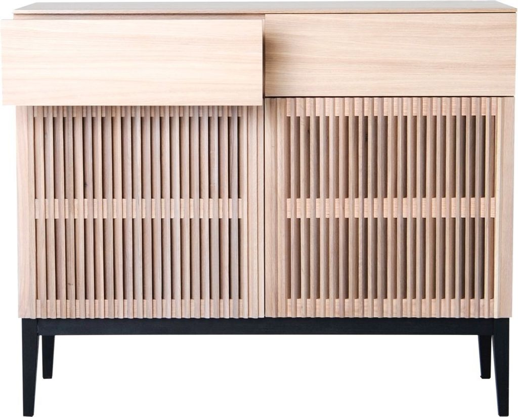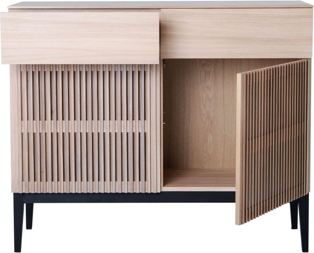 Darell-serien innehåller en rad olika vitrinskåp och sideboards. Detta skåp är tillverkat av askfanér (MDF) förutom dörrar och underrede som är av massiv ek.