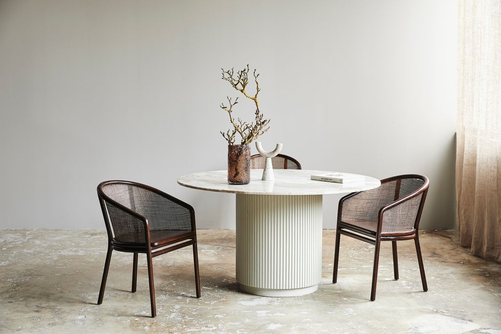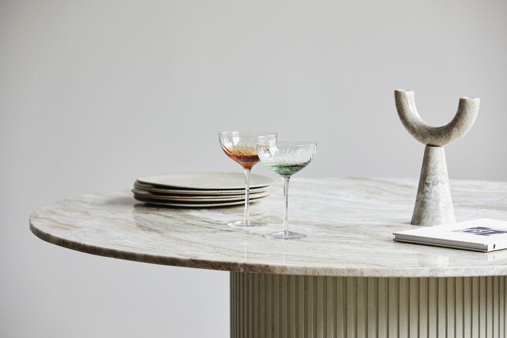 ERIE har en unik bordsskiva av marmor med ett vackert färgspel i naturliga nyanser. Marmorns basfärg är elfenben, med färgskiftningar i nyanser av sand, beige och brunt.