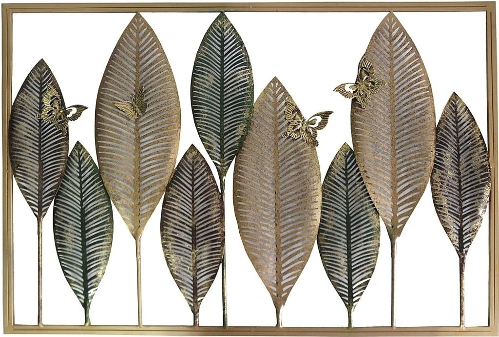 Väggprydnad i metall av blad och fjärilar, perfekt för upphängning på väggen.