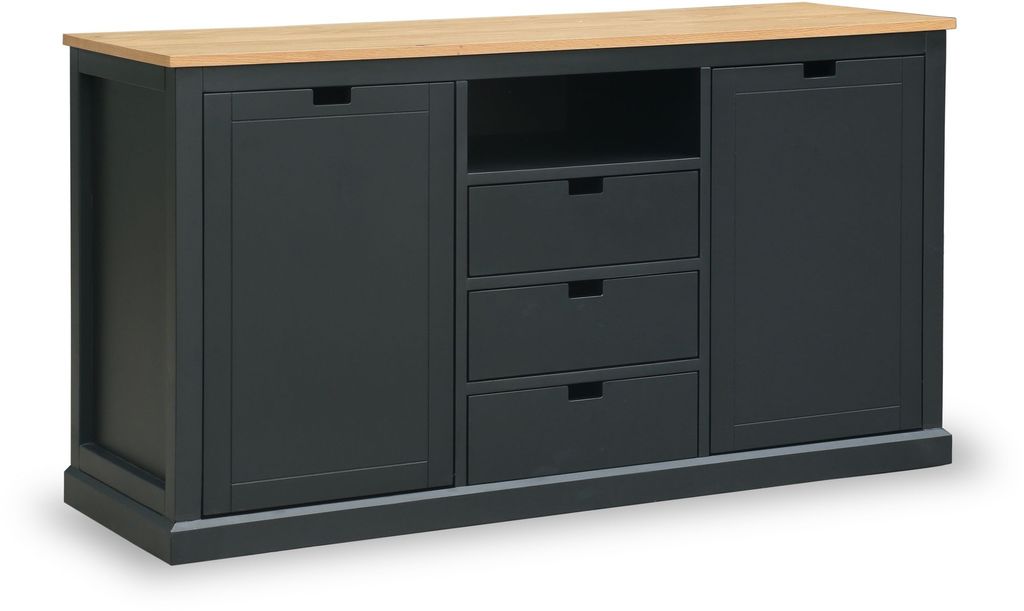 Fårö sideboard i massiv akacia och MDF, med toppskiva i oljad ekfanér och svart stomme. Sideboarden har 2 skåpdörrar och 3 lådor – en både stilren och praktisk möbel. Finns även i andra färger i samma serie.
