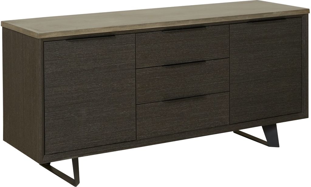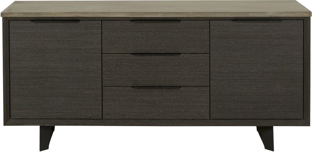 En snygg och stilren skänk med en modern design. Skänken är tillverkad av MDF med mörkbetsad ekfanér. Toppskivan är i massiv betong. Metallben.