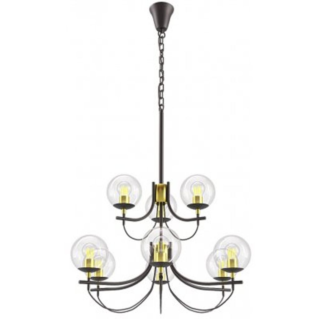 En takkrona i trendig retrodesign. Svart metall med mässingsdetaljer och glasbollar. En stor och pampig takkrona med 9 ljuskällor.