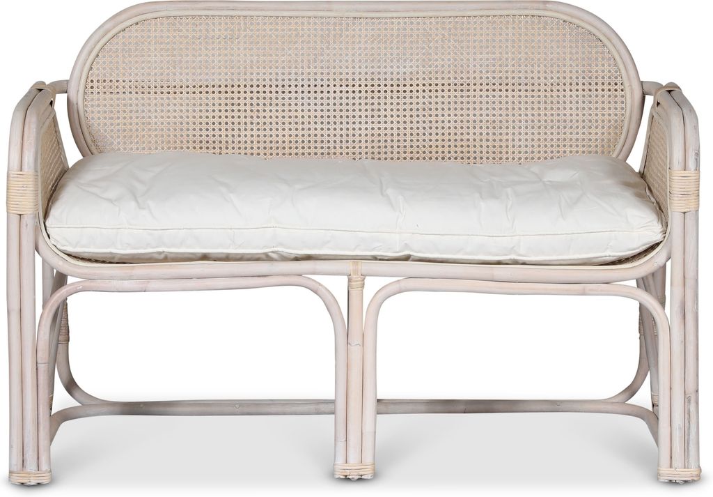 Soffa i rotting, bunden i en stabil konstruktion. Rotting är ett naturmaterial som är väldigt slitstarkt och ger möbeln en levande yta. En annan fördel med rotting är att det är ett lätt material vilket gör att det är lätt att flytta runt på möblerna. Denna soffa är i whitewash rotting, men vi erbjuder även en naturfärgad variant. En fluffig och härlig sittdyna i vitt medföljer.