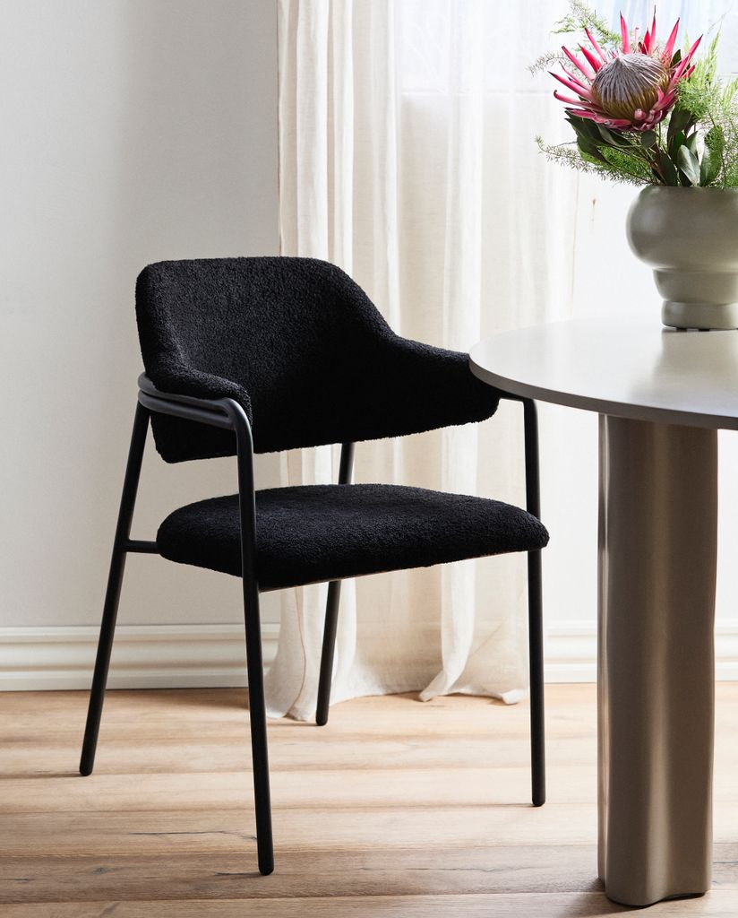 ALBERT är en tidlös stol som är lika funktionell som estetiskt tilltalande. Den passar utmärkt vid matbordet eller som en iögonfallande detalj i din inredning. Med sin smala, eleganta metallram och mjuka svarta klädsel erbjuder ALBERT både enkelhet och komfort.