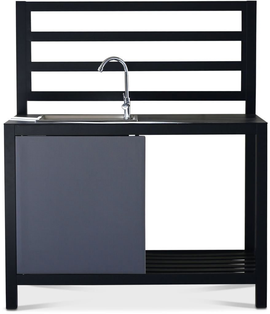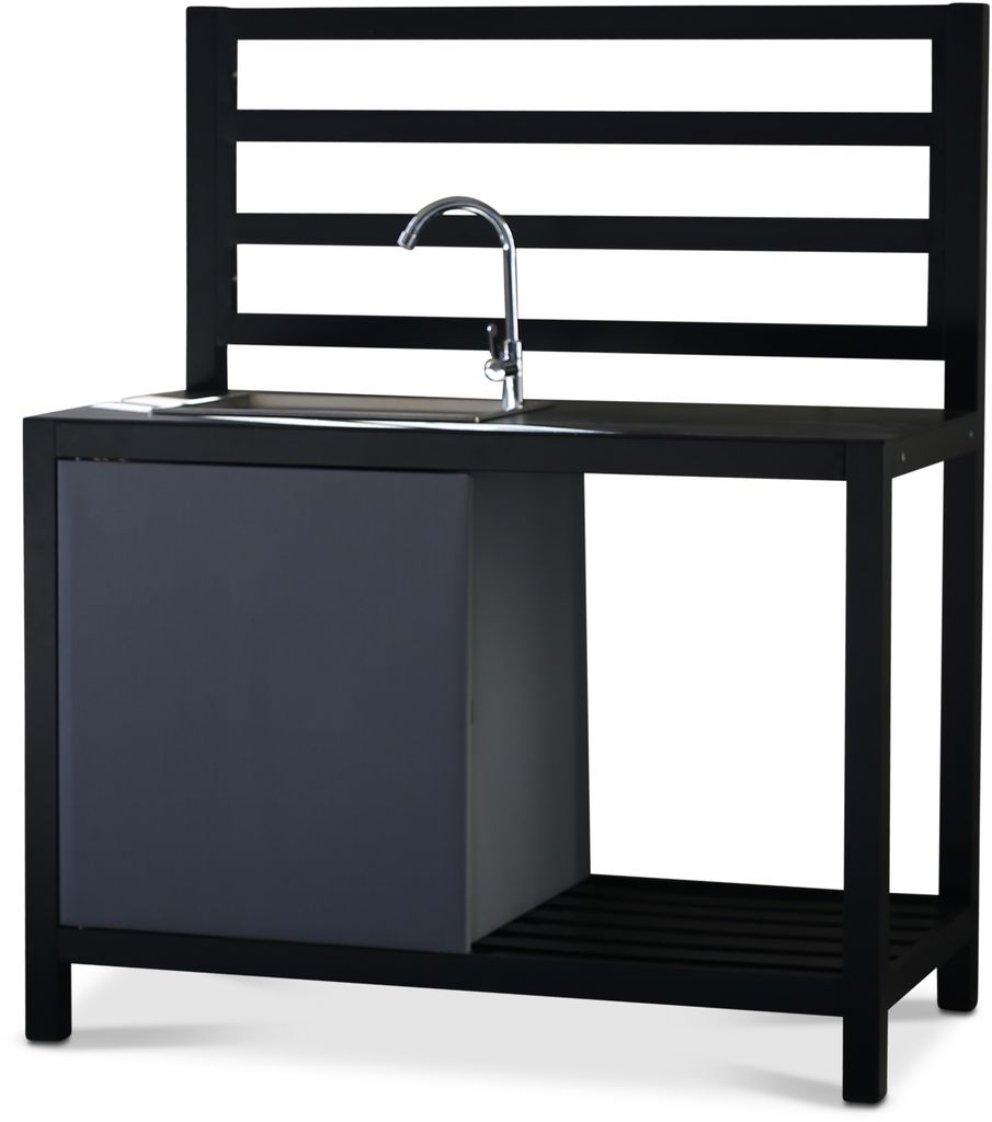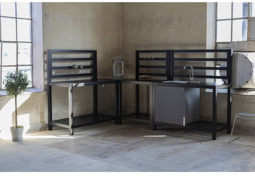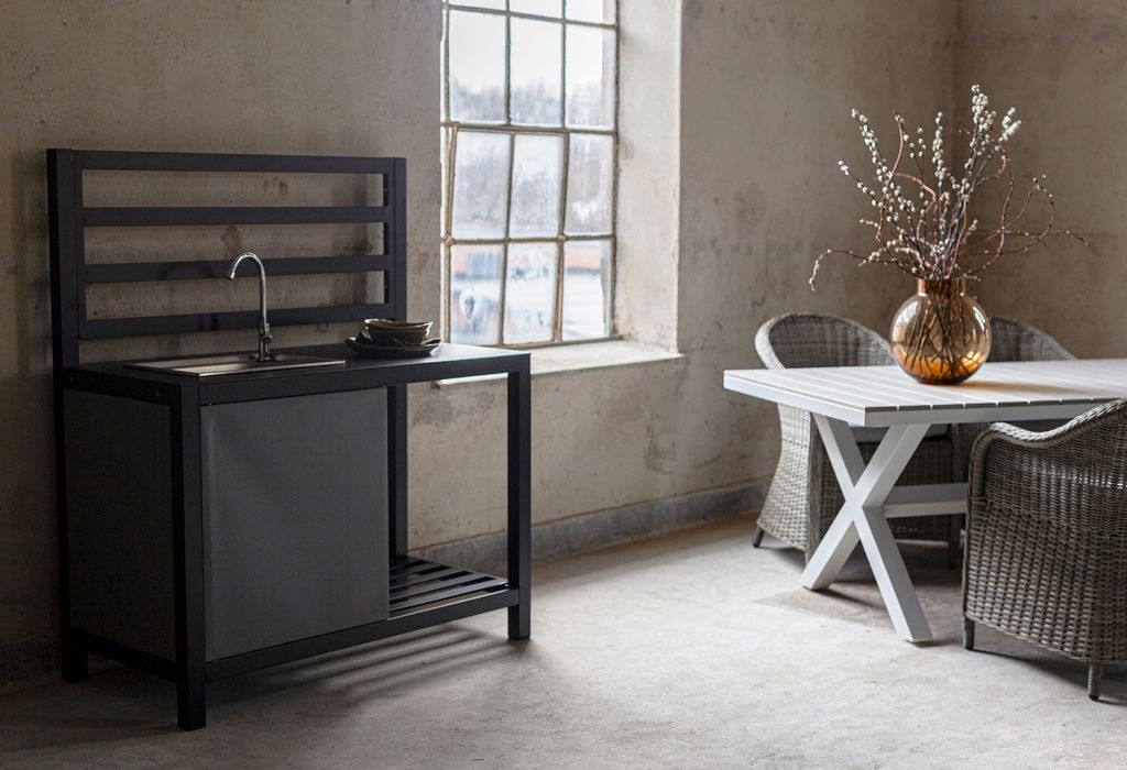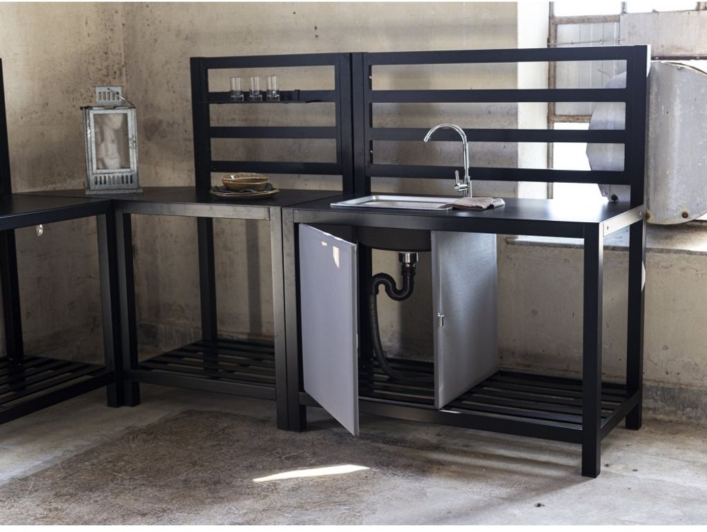 Lackö är vår byggbara serie av utekök. Huvuddelen består av köksdel med inbyggd vask och skåp med grå dörr för att dölja och förvara saker. Med tillhörande arbetsyta och hyllor. Lackö är ett praktiskt utekök där familj och vänner kan samlas under fina utekvällar.