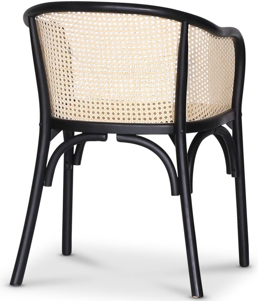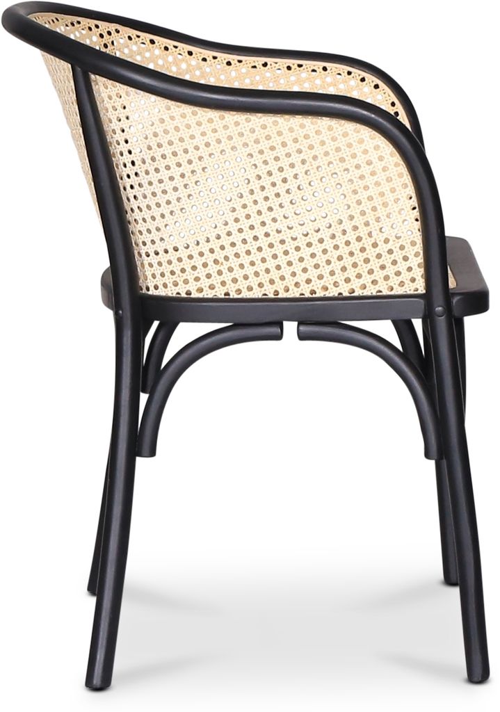 Karmstol med stomme av svart massiv bok, sits och rygg av naturfärgad rotting. Teknik för att böja träet har använts i designen. En stilig stol i neutrala färger att komplettera hemmet med.