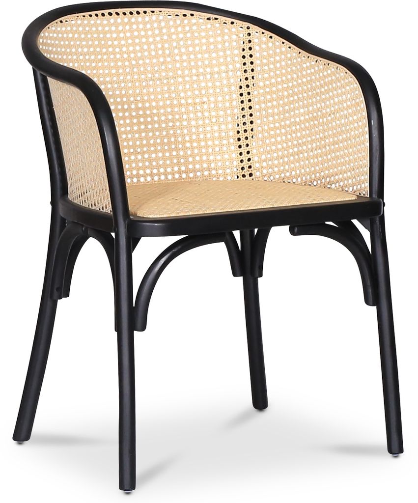 Karmstol med stomme av svart massiv bok, sits- och rygg av naturfärgad rotting. Teknik för att böja träet har använts i designen. En stilig stol i neutrala färger att komplettera hemmet med.