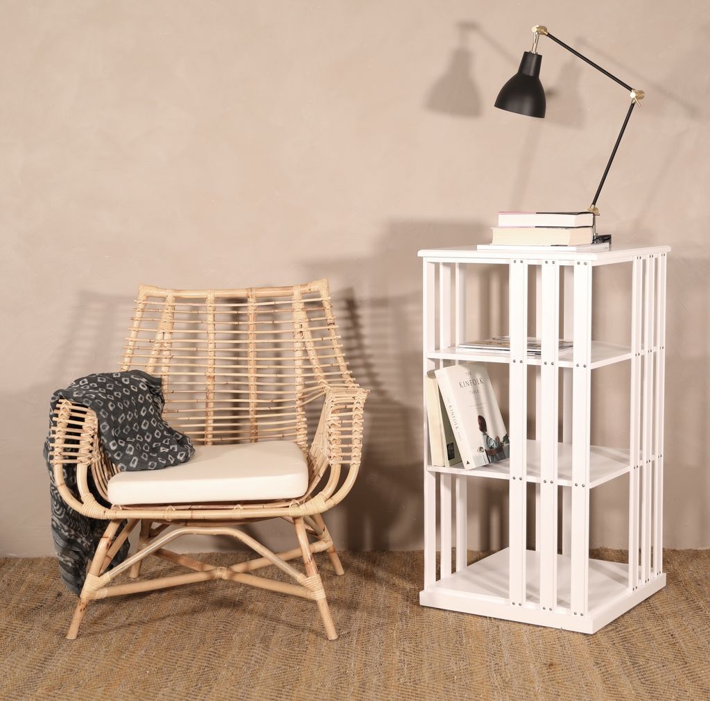 En klassisk och tidlös karusellhylla eller 'boksnurra' som den också kallas. Bokhyllan har 3 hyllplan för praktisk förvaring och hela hyllan är tillverkad av trä i vitlackad finish. Boksnurran passar perfekt in på flera olika platser i hemmet och är det perfekta valet att fylla med prydnader och litteratur. Boksnurran är roterbar.
