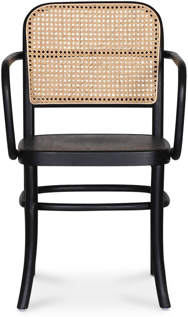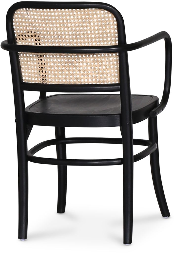 Karmstol med svart stomme av böjträ, tillverkad av bok. Sits i trä och ryggstöd i naturfärgad rotting.