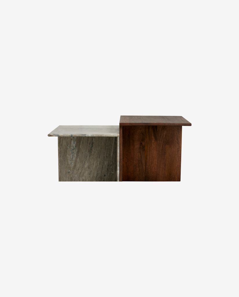 ODRA soffbord – ett set med två bord. Det mindre bordet har måtten: 40 x 50 x 50 cm. Det mindre bordet är tillverkat av marmor, medan det större bordet är gjort av mangoträ. Använd dem som ett elegant set tillsammans eller var för sig för en mångsidig och stilfull inredning.