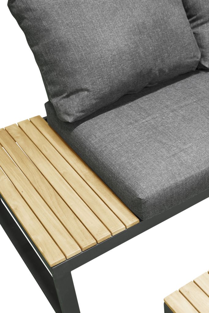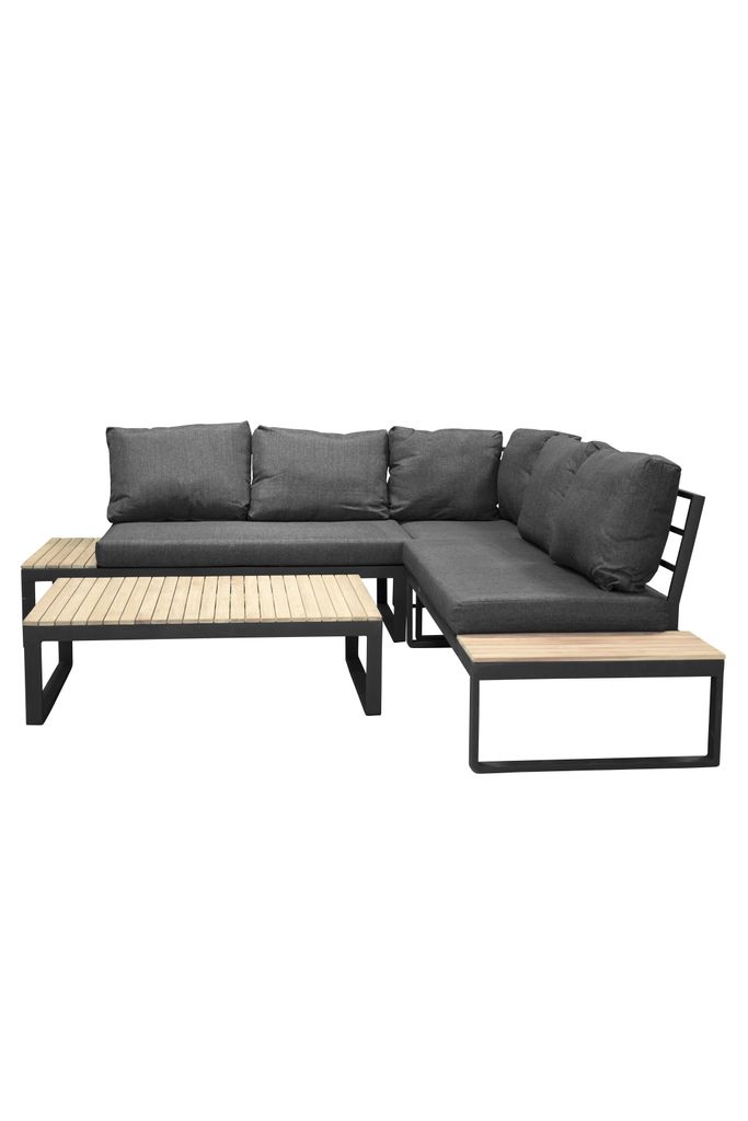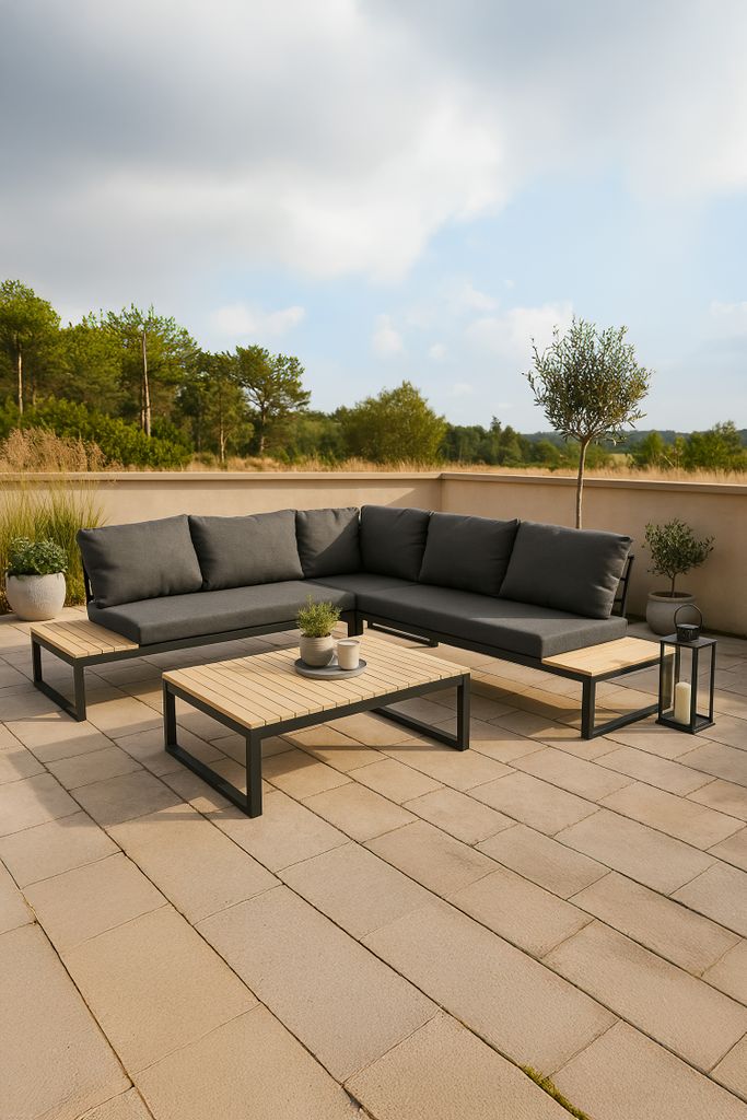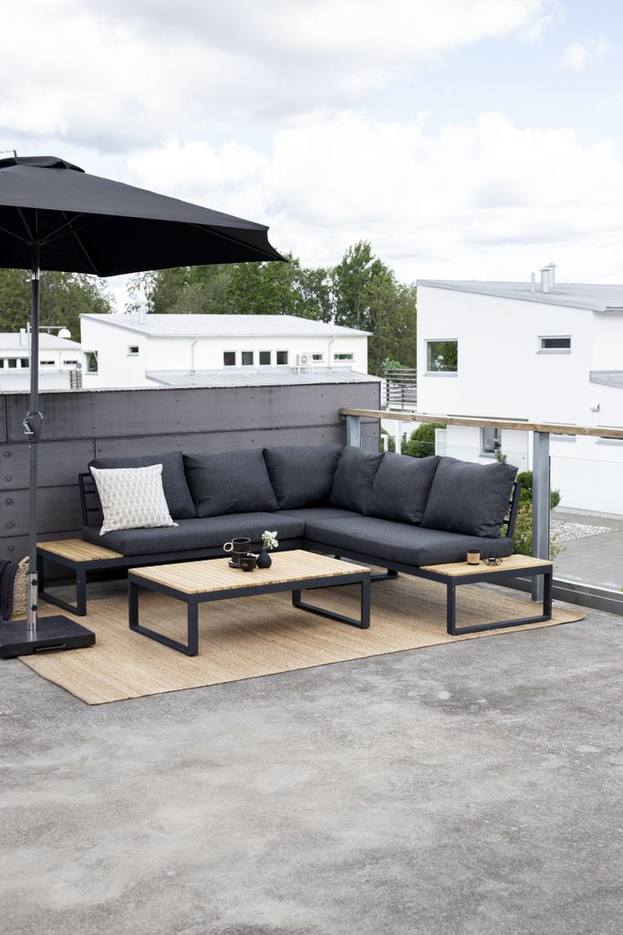Panama är en modern hörnsoffa med fyra sittplatser och en hörndel. Soffan har två stycken fasta sidobord tillverkat i svart pulverlackerad metallram samt akacia på bordsytorna. Mörkgrå dynor ingår. Skapa en charmig och iögonfallande plats på uteplatsen att samla familj och vänner kring en varm sommarkväll och njut av bekvämligheten! Skötselråd: För att dina utemöbler i Akacia/hårdträ ska bibehålla sin finish bör de oljebehandlas. Eftersom träslagen i sig inte är lika feta av naturen behöver de oljas lite då och då, även under säsong.