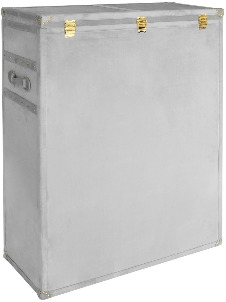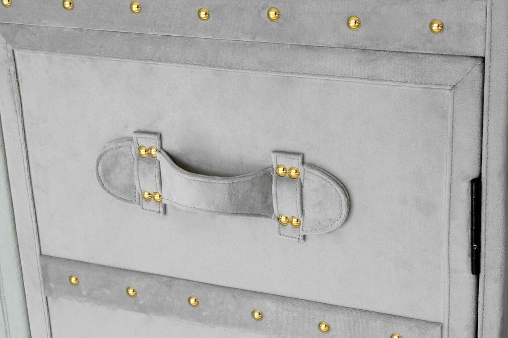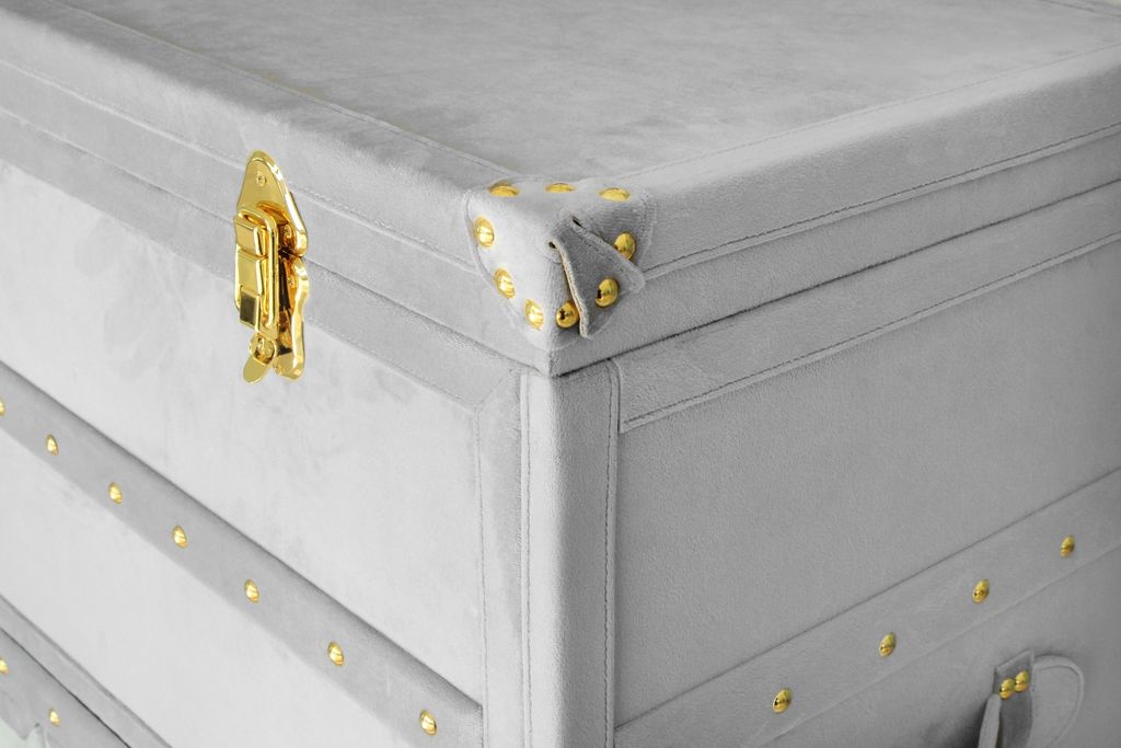 Kofferten är klädd i en snygg grå sammet med detaljer i mässing.