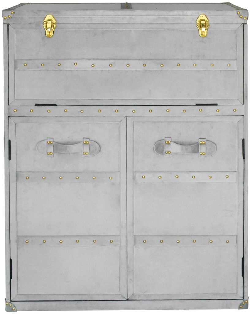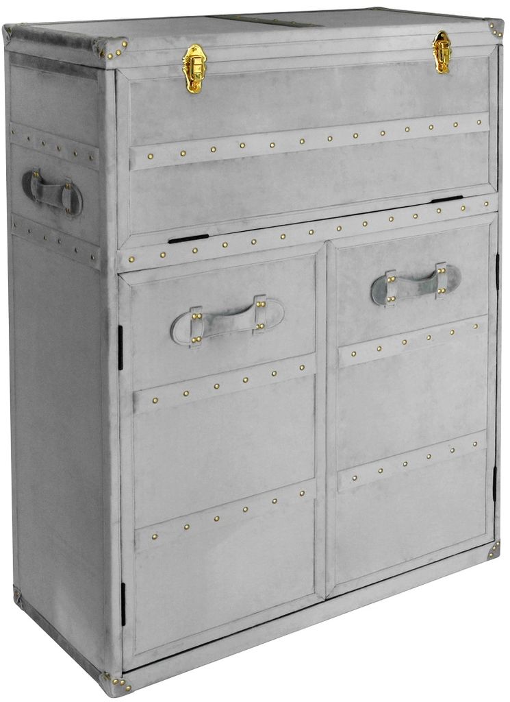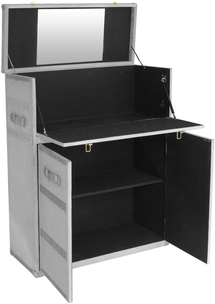 Klassiker inom inredningsvärlden. Petit vintage koffert med förvaring och utfällbar skiva med inbyggd spegel. Kan användas som sminkbord, barskåp och skrivbord. Kofferten är klädd i en snygg grå sammet med detaljer i mässing.