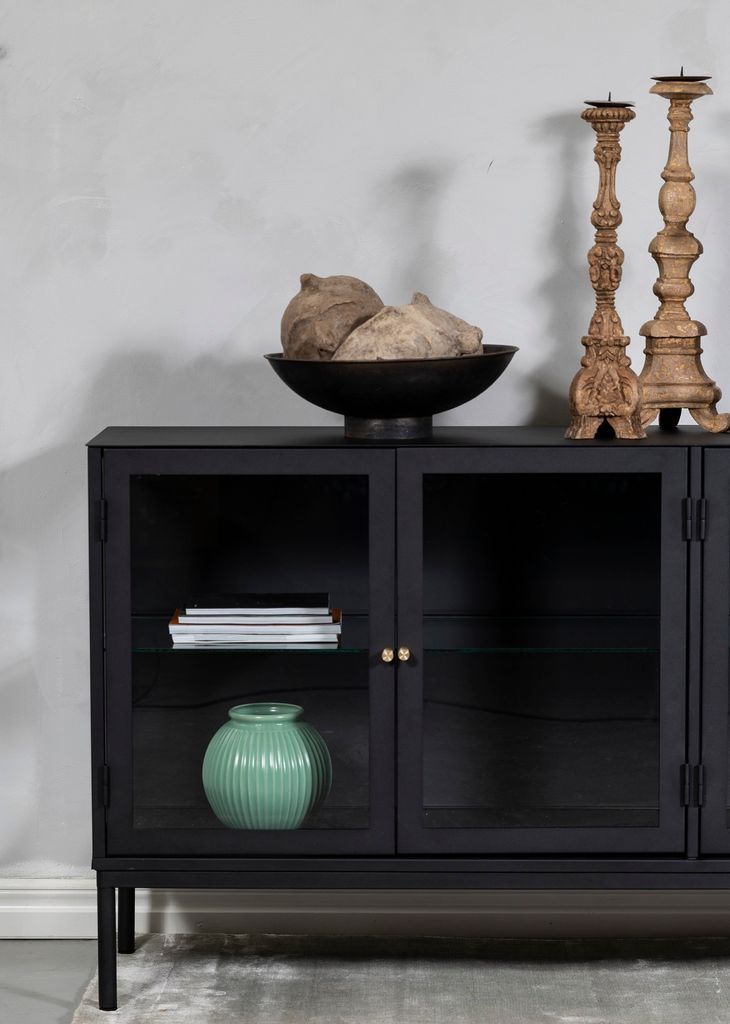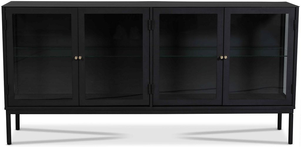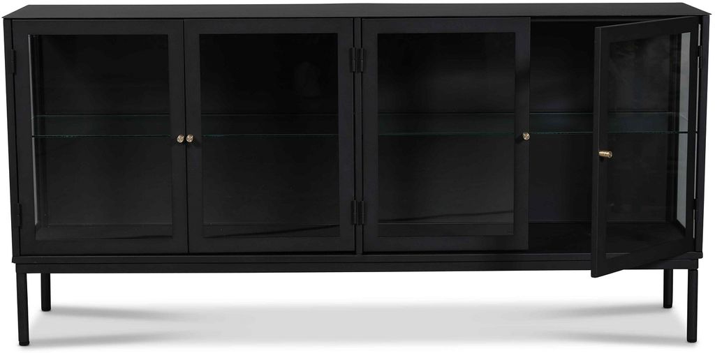 Skandinavisk design med stilrena linjer. Revel sideboard i svart sandlackad plåt med klarglas och handtag i matt mässing. 4 dörrar med klarglas samt klarglas på sidorna som släpper in ljuset i skåpet. Hyllplanen är i glas för att ge en lätt och "svävande" känsla.