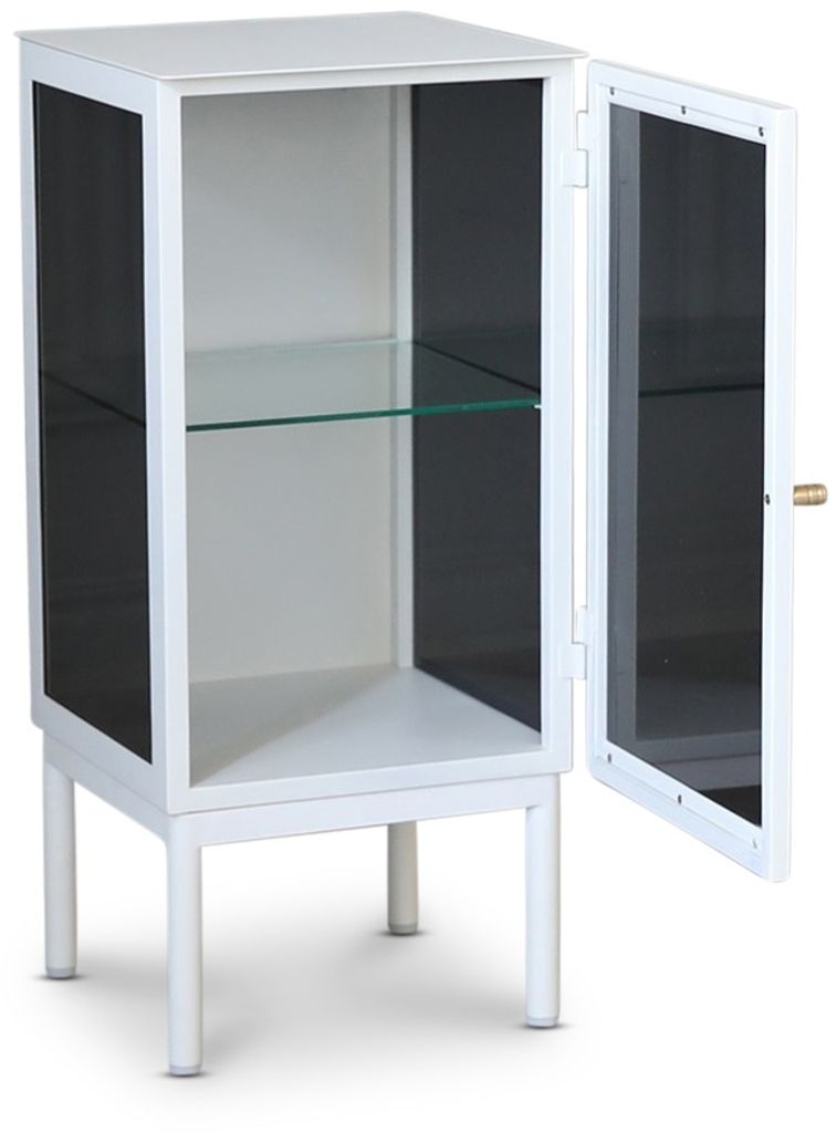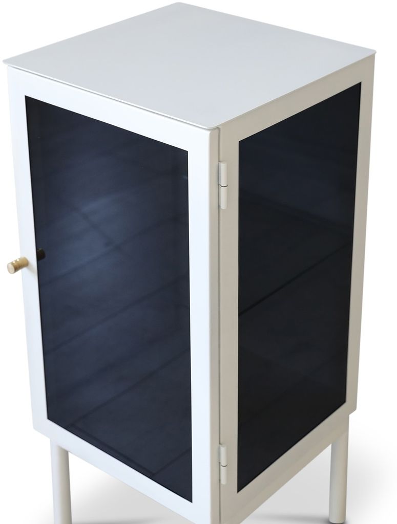 Revel är en av våra största förvaringsserier i plåt. Sandlackad plåt ger en matt yta som smälter in i alla miljöer i hemmet. Tonat glas med en mässingsknopp som handtag. Justerbar glashylla ingår. Detta är ett högerställt sängbord, dvs. dörren är högerhängd, men finns även som vänsterhängd.