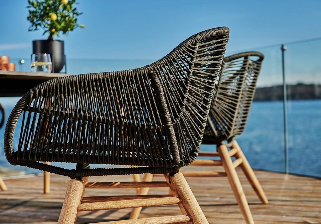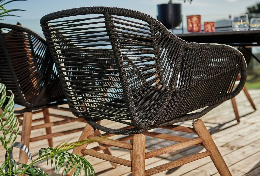 Ribe karmstolar med mörk repsits och reprygg av papperssnöre samt ben i eukalyptus. Perfekt för uteplatsen.