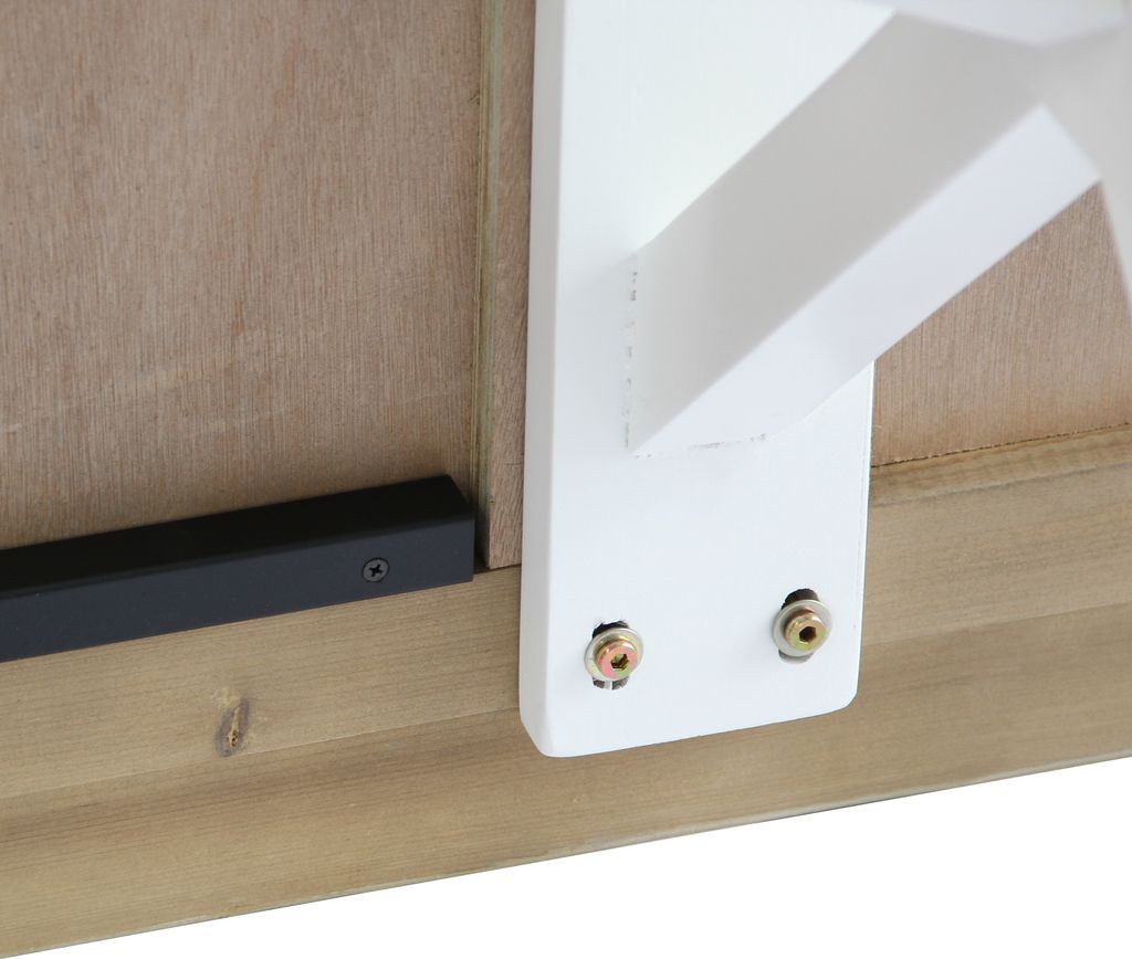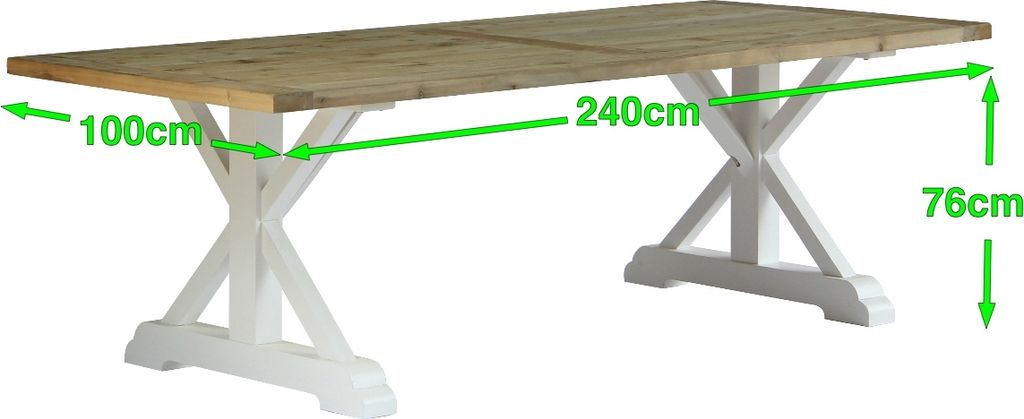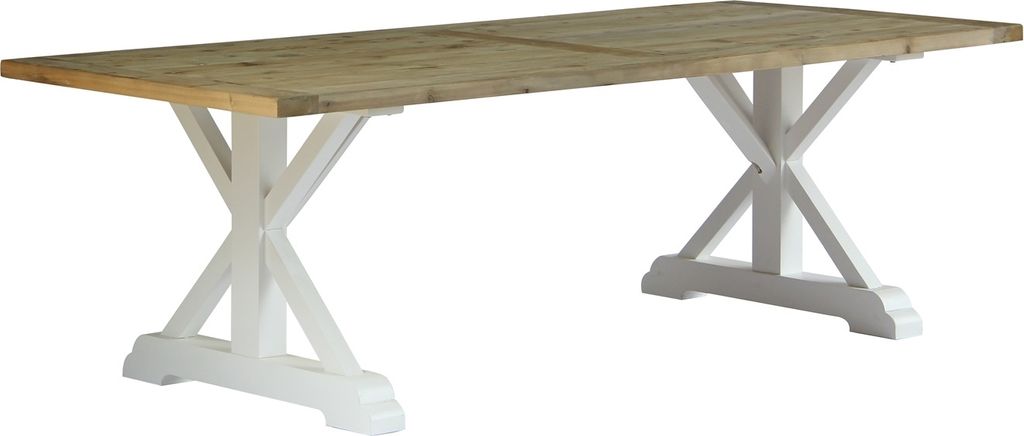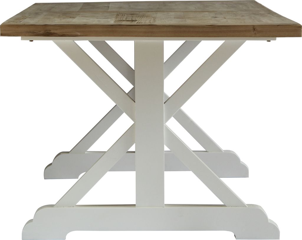 Rufus matbord med vitt kryssbensunderrede och lång toppskiva, för den större matplatsen. Bordet är tillverkat av återvunnen furu.