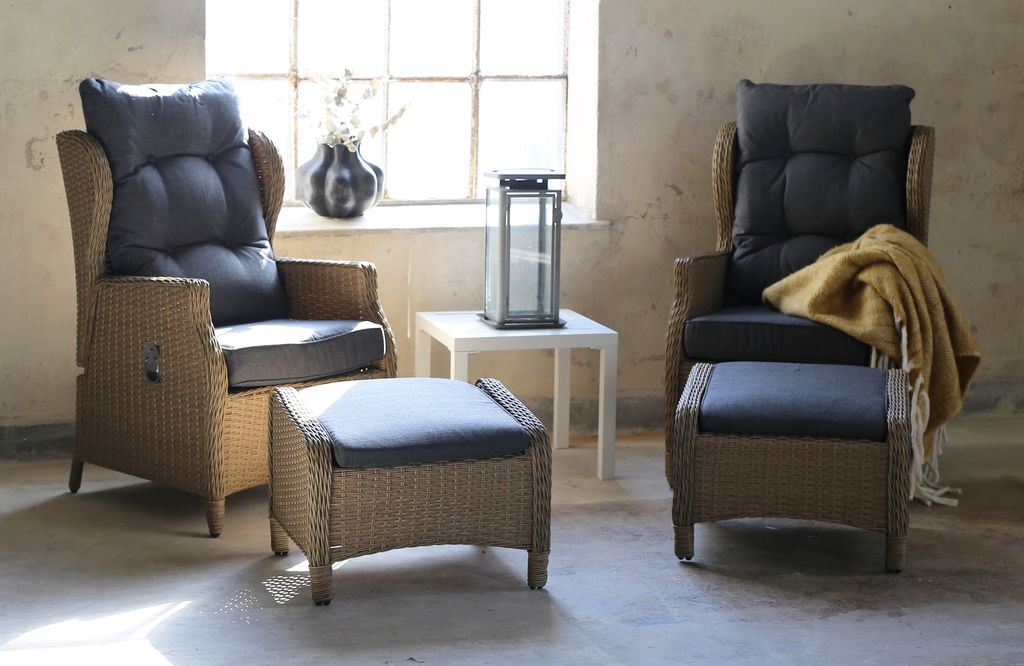 Setet består av två bekväma ställbara fåtöljer med tillhörande fotpallar i naturfärgad dubbel halvrund konstrotting med gråa dynor. Ett perfekt loungeset på uteplatsen. Fäll ner ryggen till favoritposition i solen och njut.