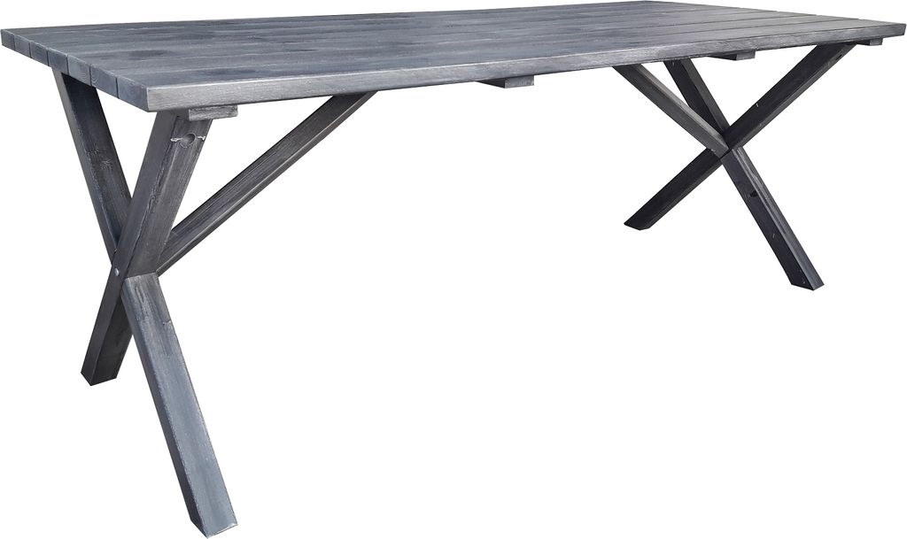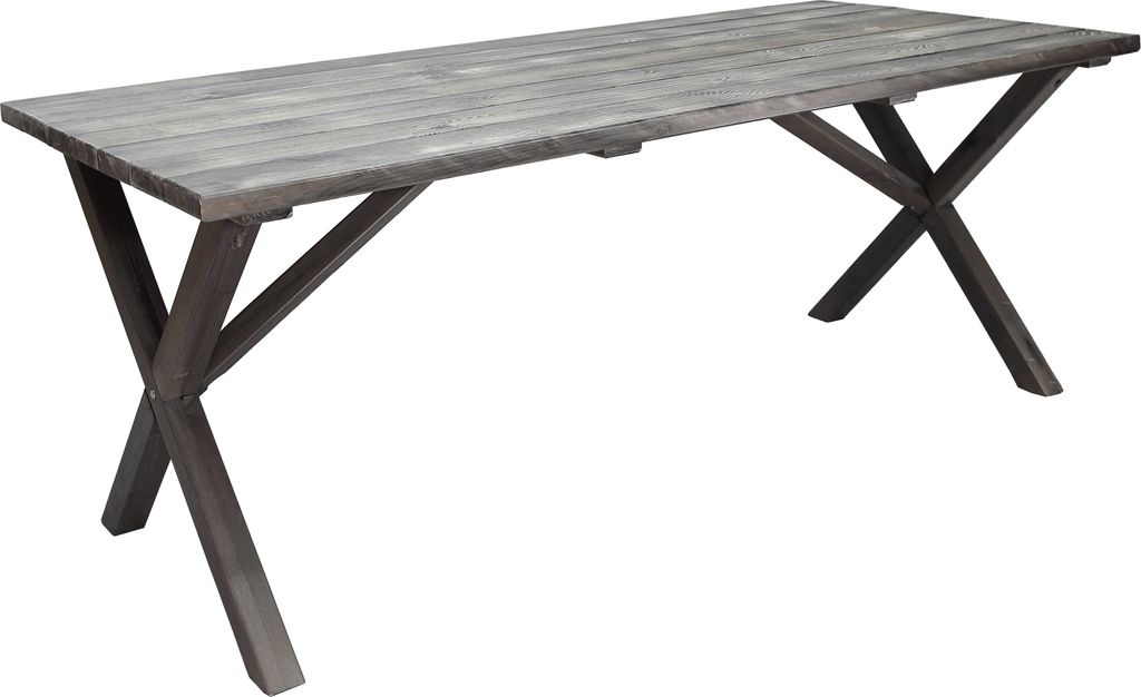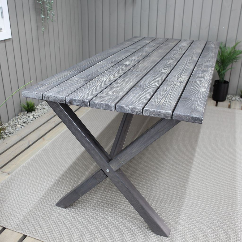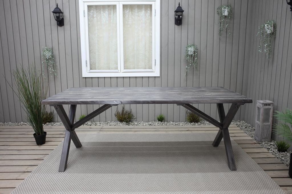 Klassiskt bord i furu med grålaserat utförande från Skånska Möbelhuset. Kryssben som ger ett elegant och klassiskt utseende. Kombinera gärna med några av våra utestolar för en komplett matgrupp till uteplatsen. Bordet har behandlats för att få den patina man förknippar med Shabby Chic. Eftersom detta arbete sker för hand får varje exemplar ett unikt utseende.