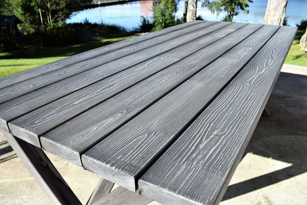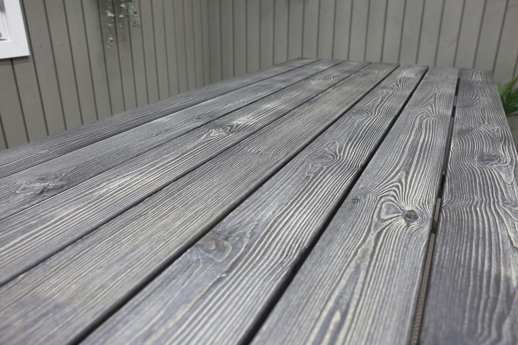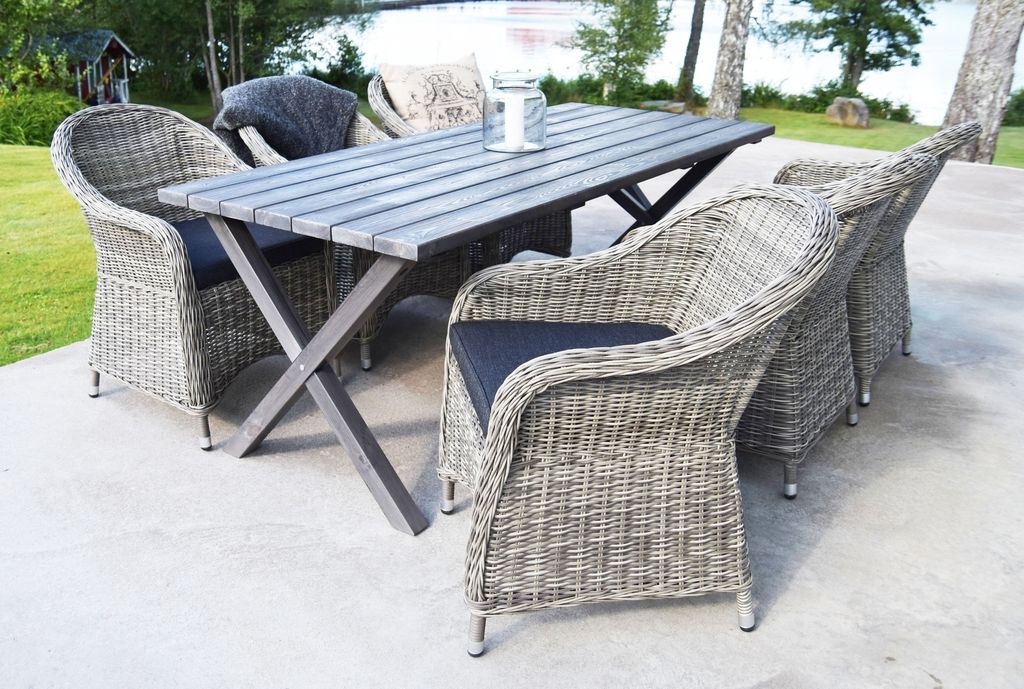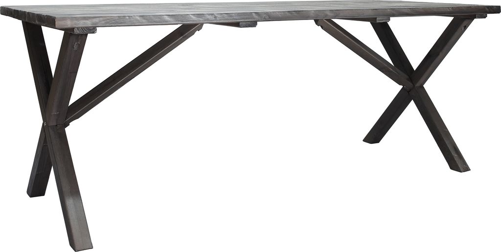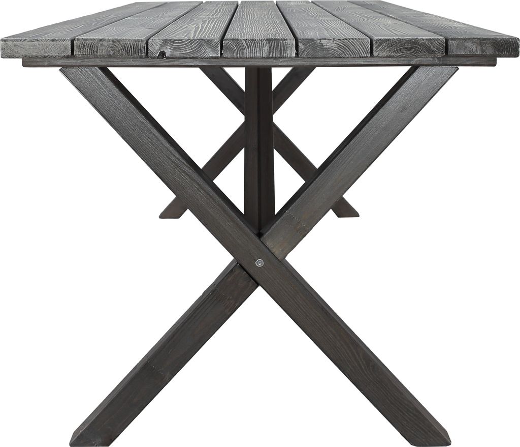 Klassiskt bord i furu med grålaserat utförande från Skånska Möbelhuset. Kryssben som ger ett elegant och klassiskt utseende. Kombinera gärna med några av våra utestolar för en komplett matgrupp till uteplatsen. Bordet har behandlats för att få den patina man förknippar med Shabby Chic. Eftersom detta arbete sker för hand får varje exemplar ett unikt utseende.