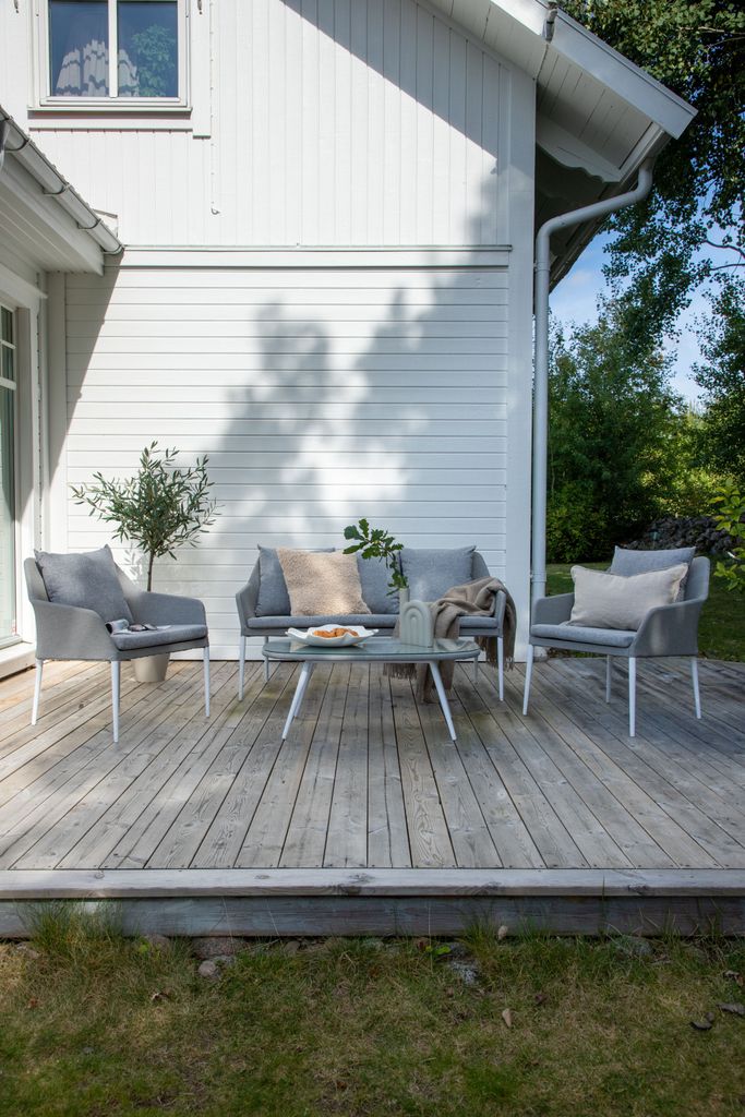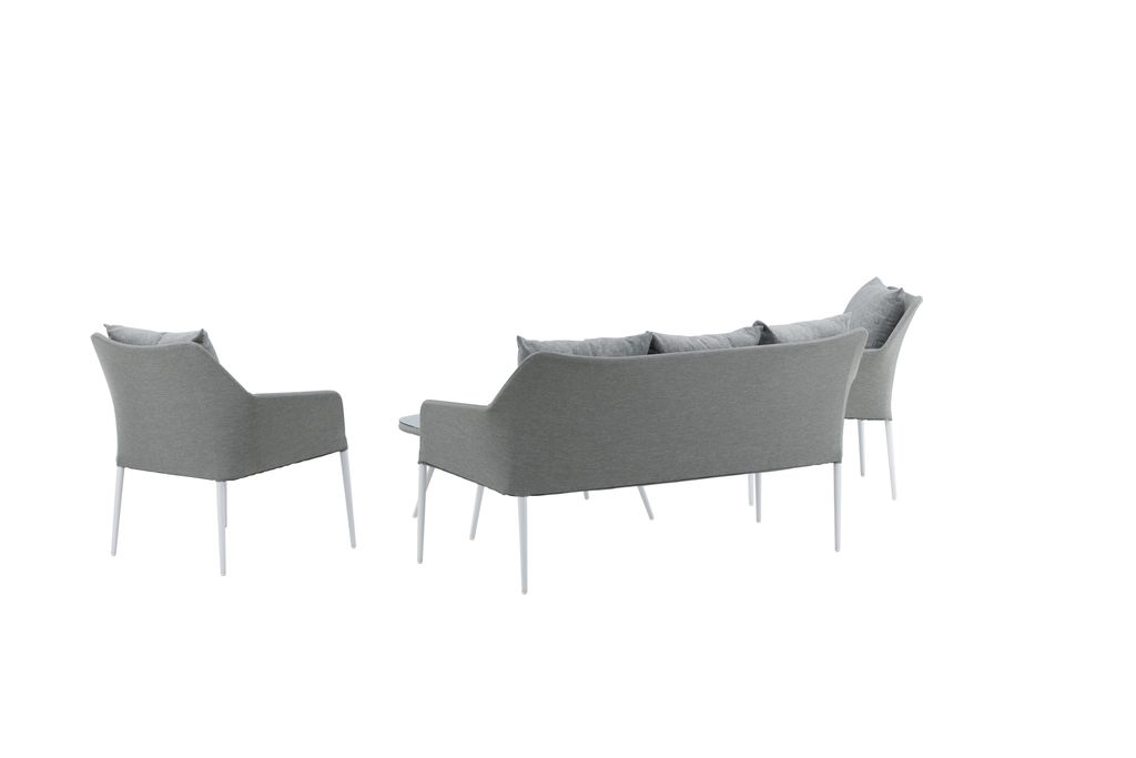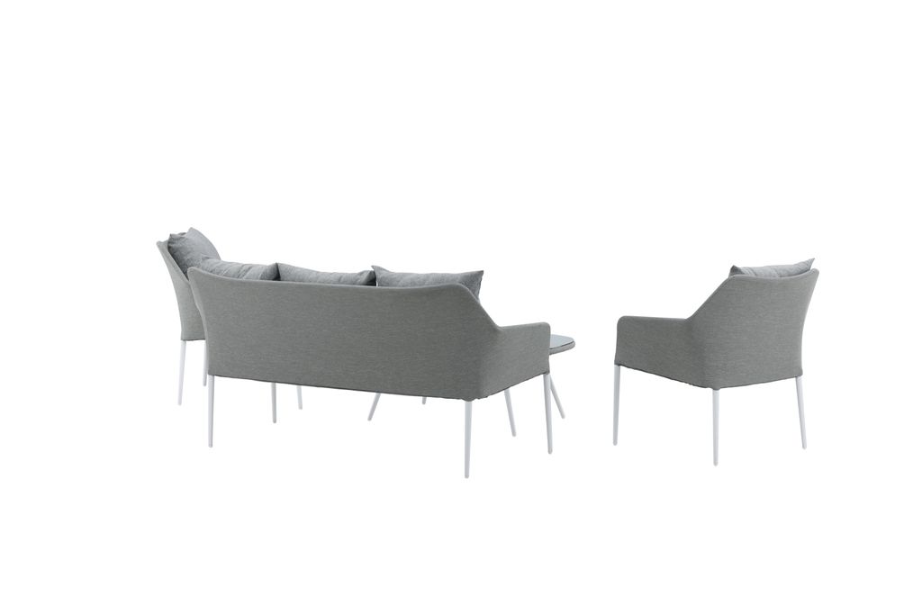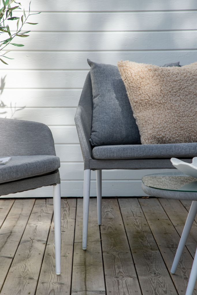 Spoga soffgrupp har en luftig design med raka nordiska former som kommer passa utmärkt på altanen eller i uterummet i sommar! Stommen är vit och sitsen tillverkad av grått tyg. Ett matchande soffbord tillkommer - möblera inbjudande och personligt!