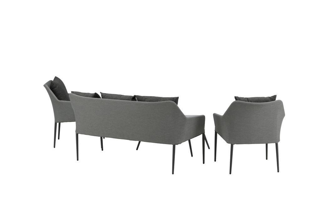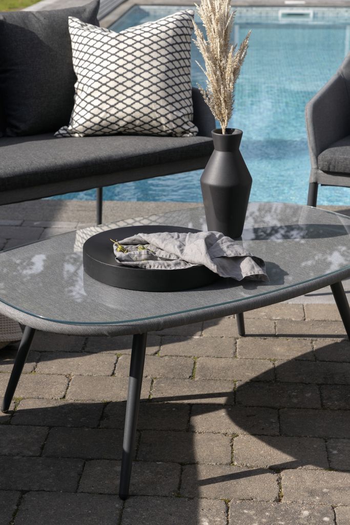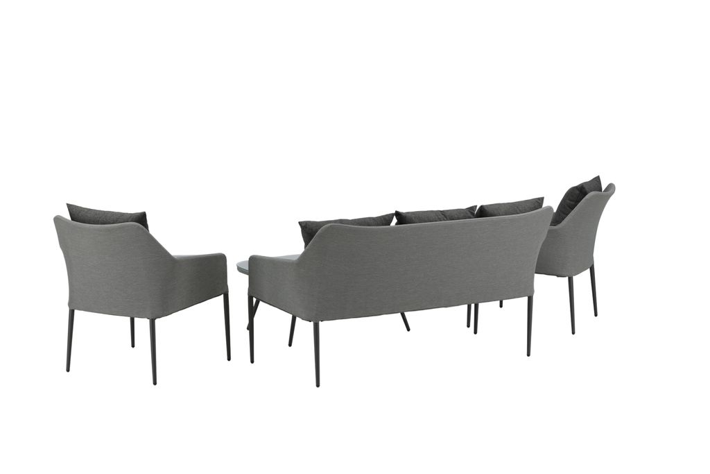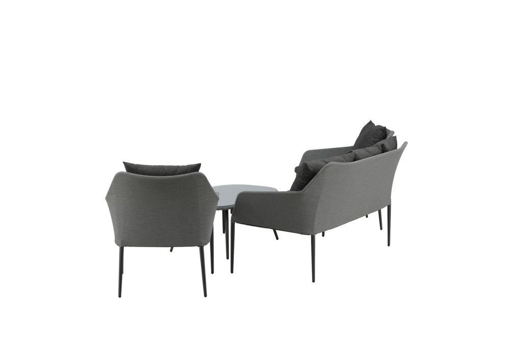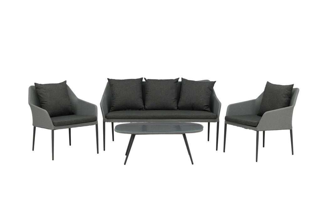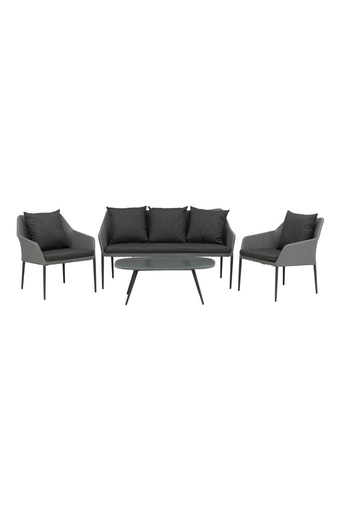 Spoga är en modern loungegrupp med inriktning på komfort – den passar perfekt på uteplatsen eller altanen. Möbelgruppen består av en tvåsitssoffa och två karmfåtöljer. Inkluderat i gruppen är också svarta mjuka dynor samt ett ovalt lågt soffbord med en bordsskiva i klarglas som skapar en exklusiv helhet. Njut av bekväma sommarkvällar i en trivsam soffgrupp!